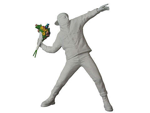《擲花者》乃神秘塗鴉藝術家Banksy其中一件招牌創作。這塗鴉靈感源自投擲氣油彈的示威者,但手上卻換成鮮花,反戰味道十足。