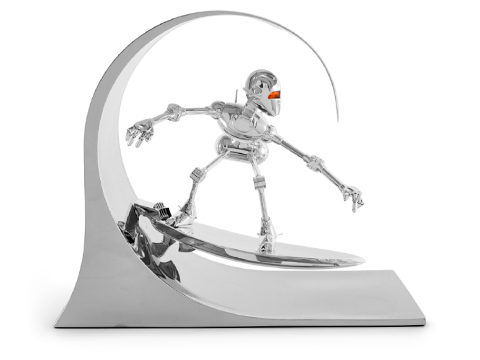 空山基 1947年出生於日本愛媛縣今治市,以描繪細緻入微的情色女性肖像畫最為聞名。他在美術領域以及插畫、工業設計方面皆頗具知名度,索尼公司所研發的原創電子寵物狗即為空山基的設計。他在1965年進入日本四國學院大學學習英文文學,其後為了學習美術,在1967年進入東京中央美術學院學習。藝術家結合金屬質地於情色的作品,造型質感獨特而嫵媚,在世界各地廣受好評。