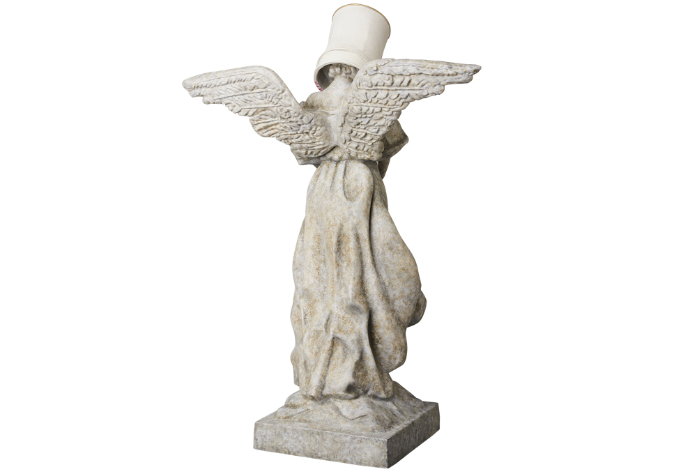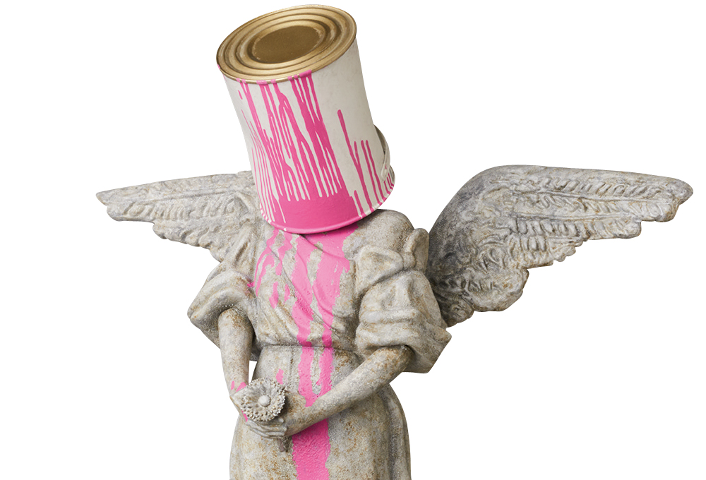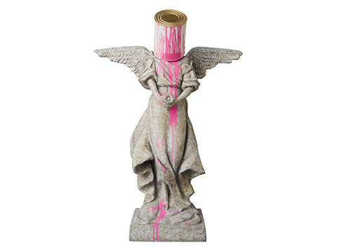 《Bucket on Head》為班克斯重構在19世紀象徵守護靈魂的天使雕塑,頭上頂著油漆桶充滿戲謔嘲諷的意味,也是對藝術形式的徹底顛覆,不僅引人注目且不失幽默,同時承襲班克斯一貫的政治和社會評論風格。